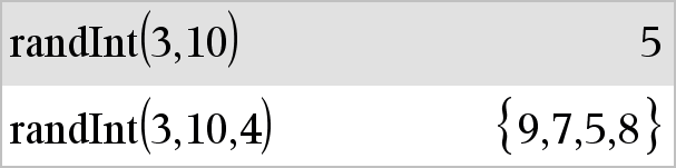 randInt(lowBound,upBound) ⇒ Ausdruck randInt(lowBound,upBound) gibt eine ganzzahlige Zufallszahl innerhalb der durch UntereGrenze (lowBound) und ObereGrenze (upBound) festgelegten Grenzen zurück. randInt(lowBound,upBound,#Trials) gibt eine Liste mit #Trials ganzzahligen Zufallszahlen innerhalb des festgelegten Bereichs zurück. |