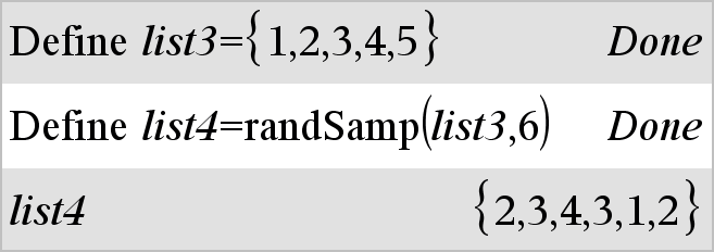 randSamp(List,#Trials[,noRepl])⇒ Liste Gibt eine Liste mit einer Zufallsstichprobe von #Trials Versuchen aus Liste (List) zurück mit der Möglichkeiten, Stichproben zu ersetzen (noRepl=0) oder nicht zu ersetzen (noRepl=1). Die Vorgabe ist mit Stichprobenersatz. |