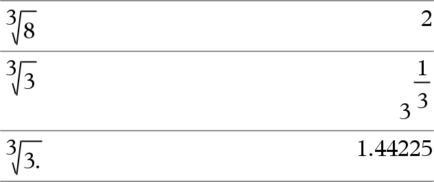 root(Ausdr1, Ausdr2) gibt die Ausdr2 Wurzel von Ausdr1 zurück. Ausdr1 kann eine reelle oder eine komplexe Fließkommakonstante, eine ganze Zahl oder eine komplexe rationale Konstante oder ein allgemeiner symbolischer Ausdruck sein. Hinweis: Siehe auch Vorlage n-te Wurzel, Seite hier. |