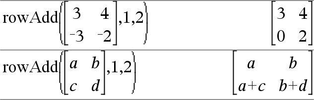 rowAdd(Matrix1, rIndex1, rIndex2) ⇒ Matrix Gibt eine Kopie von Matrix1 zurück, in der die Zeile rIndex2 durch die Summe der Zeilen rIndex1 und rIndex2 ersetzt ist. |