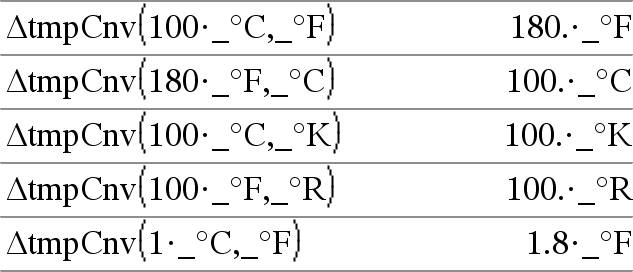 @tmpCnv(Ausdr_¡tempEinh, _¡tempEinh2) ÞAusdruck _¡tempEinh2 Hinweis: Sie können diese Funktion über die Tastatur Ihres Computers eingeben, indem Sie deltaTmpCnv(...) eintippen. Konvertiert einen durch Ausdr definierten Temperaturbereich (Differenz zwischen zwei Temperaturwerten) von einer Einheit in eine andere. Folgende Temperatureinheiten sind gültig: _¡C Celsius _¡F Fahrenheit _¡K Kelvin _¡R Rankine Wählen Sie zur Eingabe von ¡ das Symbol aus der Sonderzeichenpalette oder geben Sie @d ein. Zur Eingabe von _ drücken Sie /_. 1_¡C und 1_¡K haben denselben Absolutwert, ebenso wie 1_¡F und 1_¡R. 1_¡C ist allerdings 9/5 so groß wie 1_¡F. Ein 100_¡C Bereich (von 0_¡C bis 100_¡C) ist beispielsweise einem 180_¡F Bereich äquivalent. Zur Konvertierung eines bestimmten Temperaturwerts verwenden Sie hingegen tmpCnv(). |
