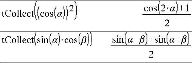tCollect(Ausdr1)ÞAusdruck Gibt einen Ausdruck zurück, in dem Produkte und ganzzahlige Potenzen von Sinus und Cosinus in eine lineare Kombination von Sinus und Cosinus von Winkelvielfachen, Winkelsummen und Winkeldifferenzen umgewandelt sind. Diese Transformation wandelt trigonometrische Polynome in eine lineare Kombination um. In manchen Fällen führt tCollect() zum Erfolg, wo die vorgegebene trigonometrische Vereinfachung nicht zum Erfolg führt. tCollect() bewirkt in beinahe allen Fällen eine Umkehrung von Transformationen, die mit tExpand() vorgenommen wurden. Manchmal lässt sich ein Ausdruck vereinfachen, wenn man in getrenntenSchritten tExpand() auf ein Ergebnis von tCollect() anwendet (oder umgekehrt). |