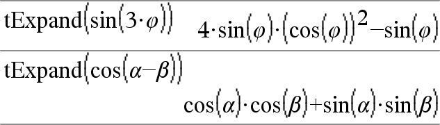 tExpand(Ausdr1)ÞAusdruck Gibt einen Ausdruck zurück, in dem Sinus und Cosinus von ganzzahligen Winkelvielfachen, Winkelsummen und Winkeldifferenzen entwickelt sind. Aufgrund der Identität (sin(x))2+(cos(x))2=1 sind viele äquivalente Ergebnisse möglich. Ein Ergebnis kann sich daher von einem in anderen Publikationen angegebenen unterscheiden. In manchen Fällen führt tExpand() zum Erfolg, wo die vorgegebene trigonometrische Vereinfachung nicht zum Erfolg führt. tExpand() bewirkt in beinahe allen Fällen eine Umkehrung von Transformationen, die mit tCollect() vorgenommen wurden. Manchmal lässt sich ein Ausdruck vereinfachen, wenn man in getrenntenSchritten tCollect() auf ein Ergebnis von tExpand() anwendet (oder umgekehrt). Hinweis: Die Skalierung von p/180 im Winkelmodus “Grad” behindert die Erkennung entwickelbarer Formen durch tExpand(). Die besten Ergebnisse werden bei Benutzung von tExpand() im Bogenmaß-Modus erzielt. |