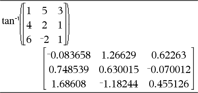tan/(Quadratmatrix1)ÞQuadratmatrix Gibt den inversen Matrix-Tangens von Quadratmatrix1 zurück. Dies ist nicht gleichbedeutend mit der Berechnung des inversen Tangens jedes einzelnen Elements. Näheres zur Berechnungsmethode finden Sie im Abschnitt cos(). Quadratmatrix1 muss diagonalisierbar sein. Das Ergebnis enthält immer Fließkommazahlen. |