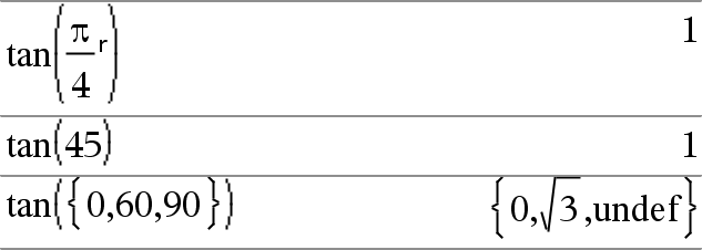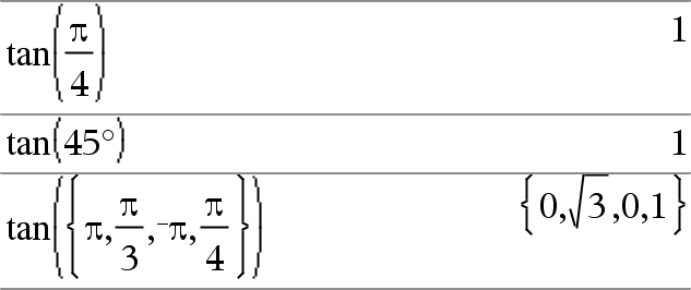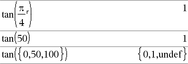 tan(Liste1) gibt in Form einer Liste für jedes Element in Liste1 den Tangens zurück. Hinweis: Das Argument wird entsprechend dem aktuellen Winkelmodus als Winkel in Grad, Neugrad oder Bogenmaß interpretiert. Sie können ¡, G oder R benutzen, um die Winkelmoduseinstellung temporär zu ändern. |