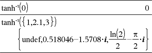 tanh/(Liste1) gibt in Form einer Liste für jedes Element aus Liste1 den inversen Tangens hyperbolicus zurück. Hinweis: Sie können diese Funktion über die Tastatur Ihres Computers eingeben, indem Sie arctanh(...) eintippen. |