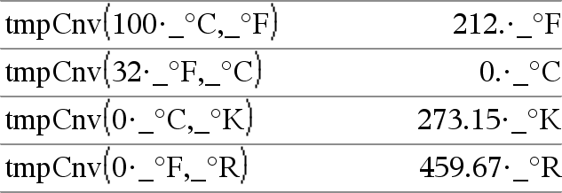tmpCnv(Ausdr_¡TempEinh, _¡TempEinh2) ÞAusdruck _¡TempEinh2 Konvertiert einen durch Ausdr definierten Temperaturwert von einer Einheit in eine andere. Folgende Temperatureinheiten sind gültig: _¡C Celsius _¡F Fahrenheit _¡K Kelvin _¡R Rankine Wählen Sie zur Eingabe von ¡ das Symbol aus der Sonderzeichenpalette des Katalogs aus. Zur Eingabe von _ drücken Sie /_. 100_¡C wird zum Beispiel in 212_¡F konvertiert. Zur Konvertierung eines Temperaturbereichs verwenden Sie hingegen @tmpCnv(). |