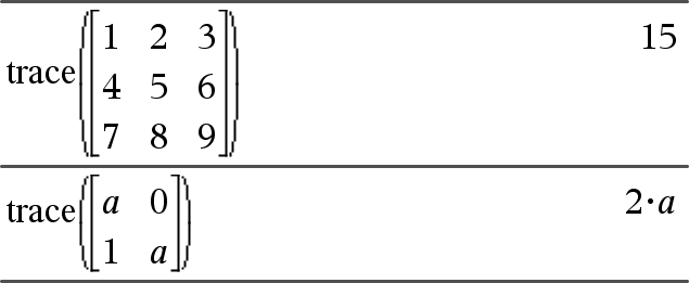 trace(Quadratmatrix)ÞAusdruck Gibt die Spur (Summe aller Elemente der Hauptdiagonalen) von Quadratmatrix zurück. |
