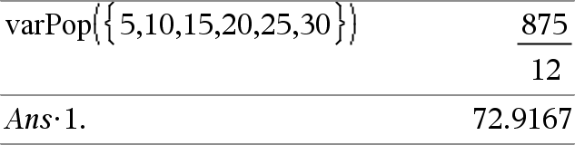 varPop(Liste[,Häufigkeitsliste])ÞAusdruck Ergibt die Populationsvarianz von Liste zurück. Jedes Häufigkeitsliste-Element gewichtet die Elemente von Liste in der gegebenen Reihenfolge entsprechend. Hinweis: Liste muss mindestens zwei Elemente enthalten. Wenn ein Element in einer der Listen leer (ungültig) ist, wird dieses Element ignoriert. Das entsprechende Element in der anderen Liste wird ebenfalls ignoriert. Weitere Informationen zu leeren Elementen finden Sie (hier). |