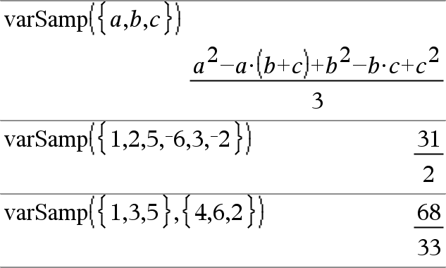 varSamp(Liste[, Häufigkeitsliste])ÞAusdruck Ergibt die Stichproben-Varianz von Liste. Jedes Häufigkeitsliste-Element gewichtet die Elemente von Liste in der gegebenen Reihenfolge entsprechend. Hinweis: Liste muss mindestens zwei Elemente enthalten. Wenn ein Element in einer der Listen leer (ungültig) ist, wird dieses Element ignoriert. Das entsprechende Element in der anderen Liste wird ebenfalls ignoriert. Weitere Informationen zu leeren Elementen finden Sie (hier). |