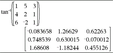 tan/(Quadratmatrix1)ÞQuadratmatrix Gibt den inversen Matrix-Tangens von Quadratmatrix1 zurück. Dies ist nicht gleichbedeutend mit der Berechnung des inversen Tangens jedes einzelnen Elements. Näheres zur Berechnungsmethode finden Sie im Abschnitt cos(). Quadratmatrix1 muss diagonalisierbar sein. Das Ergebnis enthält immer Fließkommazahlen. |