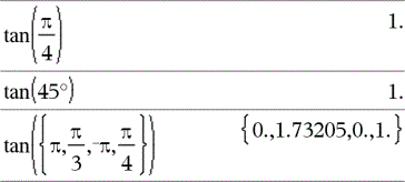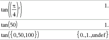 tan(Liste1) gibt in Form einer Liste für jedes Element in Liste1 den Tangens zurück. Hinweis: Das Argument wird entsprechend dem aktuellen Winkelmodus als Winkel in Grad, Neugrad oder Bogenmaß interpretiert. Sie können ¡, G oder R benutzen, um die Winkelmoduseinstellung temporär zu ändern. |