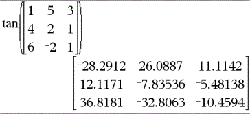 tan(Quadratmatrix1)ÞQuadratmatrix Gibt den Matrix-Tangens von Quadratmatrix1 zurück. Dies ist nicht gleichbedeutend mit der Berechnung des Tangens jedes einzelnen Elements. Näheres zur Berechnungsmethode finden Sie im Abschnitt cos(). Quadratmatrix1 muss diagonalisierbar sein. Das Ergebnis enthält immer Fließkommazahlen. |