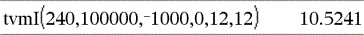 tvmI(N,PV,Pmt,FV,[PpY],[CpY],[PmtAt])ÞWert Finanzfunktion, die den jährlichen Zinssatz berechnet. Hinweis: Die in den TVM-Funktionen verwendeten Argumente werden in der Tabelle der TVM-Argumente (hier) beschrieben. Siehe auch amortTbl(), hier. |