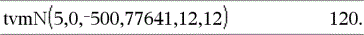 tvmN(I,PV,Pmt,FV,[PpY],[CpY],[PmtAt])ÞWert Finanzfunktion, die die Anzahl der Zahlungsperioden berechnet. Hinweis: Die in den TVM-Funktionen verwendeten Argumente werden in der Tabelle der TVM-Argumente (hier) beschrieben. Siehe auch amortTbl(), hier. |