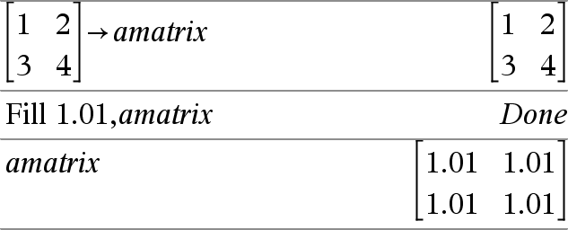 Fill Value, matrixVar ⇒ matrix Replaces each element in variable matrixVar with Value. matrixVar must already exist. |