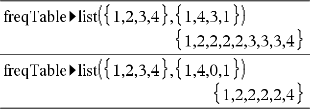 freqTable►list(List1,freqIntegerList) ⇒ list Returns a list containing the elements from List1 expanded according to the frequencies in freqIntegerList. This function can be used for building a frequency table for the Data & Statistics application. List1 can be any valid list. freqIntegerList must have the same dimension as List1 and must contain non-negative integer elements only. Each element specifies the number of times the corresponding List1 element will be repeated in the result list. A value of zero excludes the corresponding List1 element. Note: You can insert this function from the computer keyboard by typing freqTable@>list(...). Empty (void) elements are ignored. For more information on empty elements, see here. |