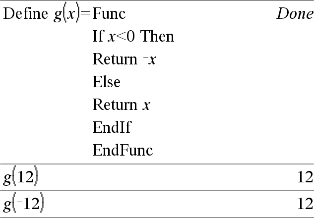 If BooleanExpr If BooleanExpr Then If BooleanExpr evaluates to true, executes the single statement Statement or the block of statements Block before continuing execution. If BooleanExpr evaluates to false, continues execution without executing the statement or block of statements. Block can be either a single statement or a sequence of statements separated with the “:” character. Note for entering the example: For instructions on entering multi-line program and function definitions, refer to the Calculator section of your product guidebook. |