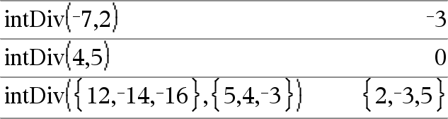 intDiv(Number1, Number2) ⇒ integer Returns the signed integer part of (Number1 ÷ Number2). For lists and matrices, returns the signed integer part of (argument 1 ÷ argument 2) for each element pair. |
