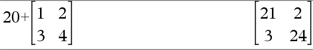 Matrice1 + ValeurÞmatrice Donne la matrice obtenue en ajoutant Valeur à chaque élément de la diagonale de Matrice1. Matrice1 doit être carrée. Remarque : utilisez .+ pour ajouter une expression à chaque élément de la matrice. |