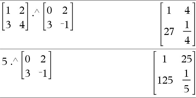 Matrice1 .^ Matrice2 Þ matrice Matrice1 .^ Matrice2 donne la matrice obtenue en élevant chaque élément de Matrice1 à la puissance de l'élément correspondant de Matrice2.