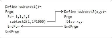 Define subtest1()= Prgm local subtest2 À Define subtest2(x,y)= Á Prgm Disp x,y EndPrgm ©Début du programme principal For i,1,4,1 subtest2(i,I*1000) Â EndFor EndPrgm |