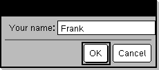 Programar comando: Interrompe o programa e mostra uma caixa de diálogo com a mensagem CadeiaDePedido e uma caixa de entrada para a resposta do utilizador. Quando o utilizador escrever uma resposta e clicar em OK, os conteúdos da caixa de entrada são atribuídos à variável var. Se o utilizador clicar em Cancelar, o programa continua sem aceitar qualquer entrada. O programa utiliza o valor anterior de var se var já tiver sido definida. O argumento DispFlag opcional podem ser qualquer expressão.
