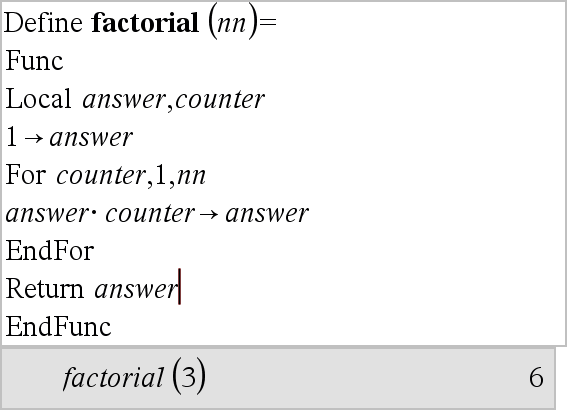 Return [Expr] Devolve Expr como resultado da função. Utilize num bloco Func ... EndFunc. Nota: Utilize Return sem um argumento num bloco Prgm...EndPrgm para sair de um programa. Obs para introdução do exemplo: Para obter instruções sobre como introduzir programas com várias linhas e definições de funções, consulte a secção Calculadora do manual do utilizador do produto. |