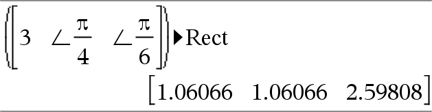 Vetor ►Rect Nota: Pode introduzir este operador através da escrita de @Rect no teclado do computador. Apresenta o Vetor na forma retangular [x, y, z] O vetor tem de ser de dimensão 2 ou 3 e pode ser uma linha ou uma coluna. Nota: ►Rect é uma instrução de formato de visualização, não uma função de conversão. Só pode utilizá-la no fim de uma linha de entrada e não actualiza ans. Nota: Consulte também ►Polar, aqui. |