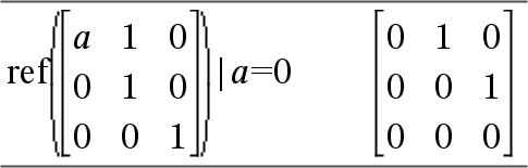 ref(Matriz1[, Tol]) ⇒ matriz Devolve a forma de escalão-linha de Matriz1. Opcionalmente, qualquer elemento da matriz é tratado como zero se o valor absoluto for inferior a Tol. Esta tolerância é utilizada apenas se a matriz tiver entradas de ponto flutuante e não contiver nenhuma variável simbólica sem nenhum valor atribuído. Caso contrário, Tol é ignorado.