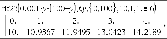 Equação diferencial: y'=0.001*y*(100-y) e y(0)=10 Para ver o resultado completo, prima 5 e, de seguida, utilize 7 e 8 para mover o cursor. Mesma equação com diftol definido para 1.E-6 Sistema de equações:
