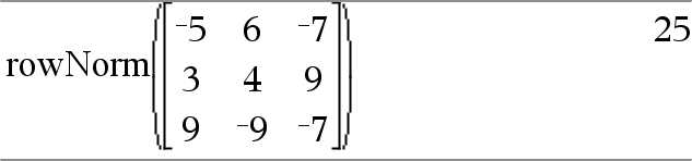 rowNorm(Matriz) ⇒ expressão Devolve o máximo das somas dos valores absolutos dos elementos nas linhas em Matriz. Nota: Todos os elementos da matriz têm de ser simplificados para números. Consulte também colNorm(), aqui. |