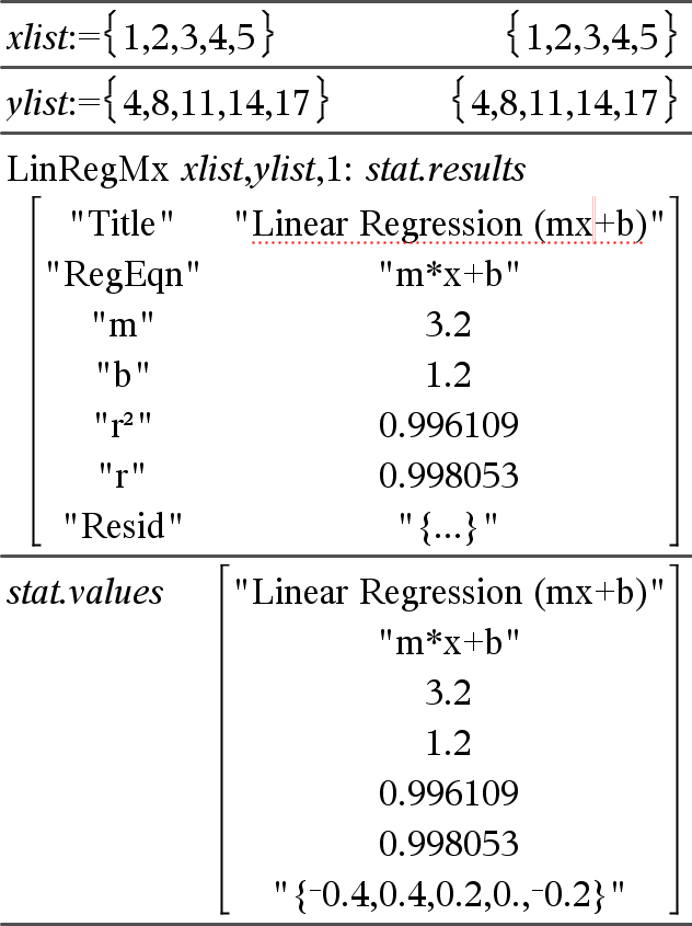 stat.results Apresenta os resultados de um cálculo estatístico. Os resultados aparecem como um conjunto de pares de valores de nomes. Os nomes específicos apresentados estão dependentes do comando ou da função estatística avaliada mais recentemente. Pode copiar um nome ou um valor e colá-lo noutra localização. Nota: Evite definir variáveis que utilizem os mesmos nomes das variáveis utilizadas para análise estatística. Em alguns casos, pode ocorrer uma condição de erro. Os nomes das variáveis utilizados para análise estatística são listados na tabela abaixo. |