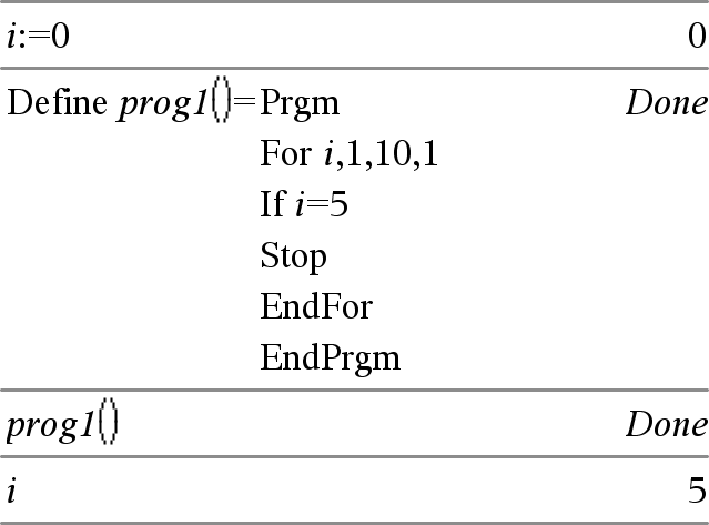 Stop Programar comando: Termina o programa. Stop não é permitido em funções. Obs para introdução do exemplo: Para obter instruções sobre como introduzir programas com várias linhas e definições de funções, consulte a secção Calculadora do manual do utilizador do produto. |