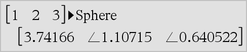 Vector 4Sphere Nota: Pode introduzir esta função através da escrita de @>Sphere no teclado. Apresenta o vector da linha ou coluna em forma esférica [r ±q ±f]. O vector tem de ser de dimensão 3 e pode ser um vector da linha ou coluna. Nota: 4Sphere é uma instrução de formato de visualização, não uma função de conversão. Só pode utilizá-la no fim da linha de entrada. |