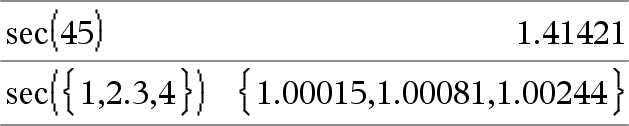sec/(Valor1) Þ valor sec/(Lista1) Þ lista Devolve o ângulo cuja secante é Valor1 ou devolve uma lista com as secantes inversas de cada elemento de Lista1. Nota: O resultado é devolvido como um ângulo expresso em graus, gradianos ou radianos, de acordo com a definição do modo de ângulo actual. Nota: Pode introduzir esta função através da escrita de arcsec(...) no teclado do computador. |