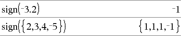 sign(Valor1) Þvalor sign(Lista1) Þlista sign(Matriz1) Þmatriz Para Valor1 real ou complexo, devolve Valor1 / abs(Valor1) quando Valor1 ƒ 0. Devolve 1 se Valor1 for positivo. Devolve L1 se Valor1 for negativo. sign(0) devolve „1 se o modo do formato complexo for Real; caso contrário, devolve-se a si próprio. sign(0) representa o círculo no domínio complexo. Para uma lista ou matriz, devolve os sinais de todos os elementos. |