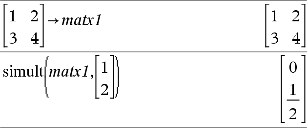 simult(MatrizCoef, VectorConst [, Tol ]) Þmatriz Devolve um vector da coluna que contém as soluções para um sistema de equações lineares. Nota: Consulte também MatrizCoef tem de ser uma matriz quadrada que contenha os coeficientes das equações. VectorConst tem de ter o mesmo número de linhas (a mesma dimensão) que MatrizCoef e conter as constantes. Opcionalmente, qualquer elemento da matriz é tratado como zero se o valor absoluto for inferior a Tol. Esta tolerância só é utilizada se a matriz tiver entradas de ponto flutuante e não contiver variáveis simbólicas sem um valor atribuído. Caso contrário, Tol é ignorado.