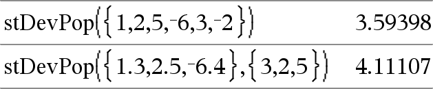 stDevPop(Lista [, ListFreq ])Þ Devolve o desvio padrão da população dos elementos em Lista. Cada elemento de ListFreq conta o número de ocorrências consecutivas do elemento correspondente em Lista. Nota: Lista tem de ter pelo menos dois elementos. Os elementos (nulos) vazios são ignorados. Para mais informações sobre os elementos vazios, consulte aqui. |