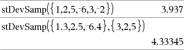 stDevSamp(Lista [, ListaFreq ]) Þexpressão Devolve o desvio padrão da amostra dos elementos em Lista. Cada elemento de ListFreq conta o número de ocorrências consecutivas do elemento correspondente em Lista. Nota: Lista tem de ter pelo menos dois elementos. Os elementos (nulos) vazios são ignorados. Para mais informações sobre os elementos vazios, consulte aqui. |
