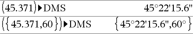 Expr1 ►DD ⇒ valueList1 Note: You can insert this operator from the computer keyboard by typing @>DD. Returns the decimal equivalent of the argument expressed in degrees. The argument is a number, list, or matrix that is interpreted by the Angle mode setting in gradians, radians or degrees. |