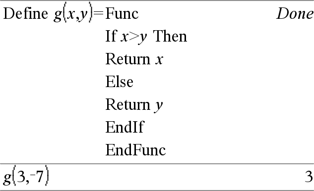 Define Program(Param1, Param2, ...) = Prgm In this form, the user-defined function or program can execute a block of multiple statements. Block can be either a single statement or a series of statements on separate lines. Block also can include expressions and instructions (such as If, Then, Else, and For). Note for entering the example: For instructions on entering multi-line program and function definitions, refer to the Calculator section of your product guidebook. Note: See also Define LibPriv, here, and Define LibPub, here. |