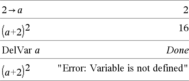 DelVar Var. deletes all members of the Var. variable group (such as the statistics stat.nn results or variables created using the LibShortcut() function). The dot (.) in this form of the DelVar command limits it to deleting a variable group; the simple variable Var is not affected. |