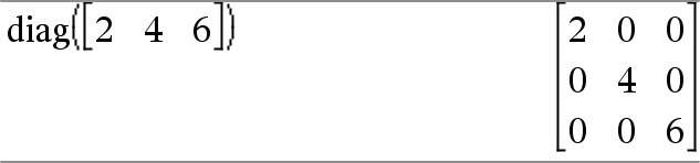 diag(squareMatrix) ⇒ rowMatrix Returns a row matrix containing the elements from the main diagonal of squareMatrix. squareMatrix must be square. |
