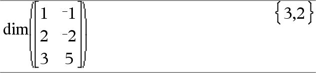dim(Matrix) ⇒ list Returns the dimensions of matrix as a two-element list {rows, columns}. |