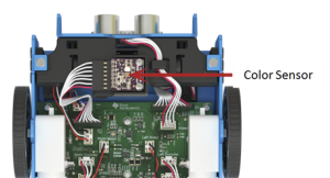 O sensor de cor montado na parte inferior deteta a cor da superfície. Também pode detetar a escala de cinzentos de preto (0) a branco (255). Mede a cor da superfície. Usado para identificar cores e executar comandos do Hub do Rover com base na cor. |