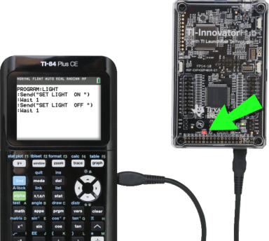 Das folgende Programm eines TI CE Grafiktaschenrechners verwendet die Befehle Send und Wait zum Blinkenlassen der geräteeigenen roten LED in dem Hub. Die Befehle sind in einer Schleife „For…End“ enthalten, die den EIN/AUS Blinkzyklus für 10 Iterationen wiederholt.