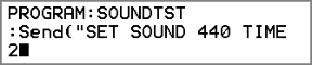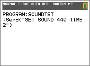 In diesem Beispiel für den TI CE Grafiktaschenrechner wird der Befehl Send („SET SOUND 440 TIME 2“) erstellt, um einen Ton von 440 Hz für zwei Sekunden auf dem geräteeigenen Lautsprecher erklingen zu lassen.