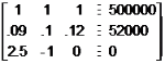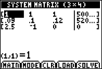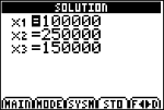 8. Choisissez SOLVE (appuyez sur s) pour résoudre le système d'équations. Vous constatez que l'entreprise a emprunté 100 000 dollars à 9 %, 250 000 dollars à 10 % et 150 000 dollars à 12 %.