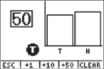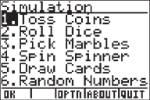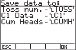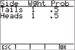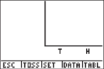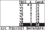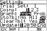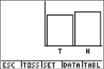 ESC pour revenir à l’écran précédent, TOSS pour lancer une pièce et obtenir d’autres lancers de pièce, SET pour afficher l’écran Settings (voir ci-dessous), DATA pour stocker les données collectées dans une liste, TABL pour afficher un tableau des essais et GRPH pour représenter graphiquement des essais. Vous pouvez basculer entre le tableau et le graphique. |